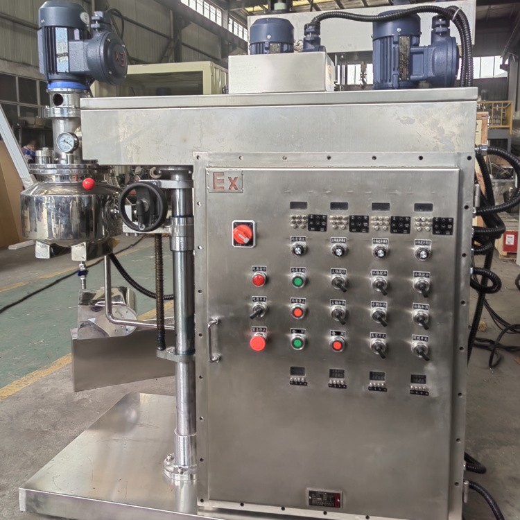 第三種是分散盤式溶解攪拌器,在均質(zhì)乳化機(jī)的攪拌軸底端裝有一圓盤狀的攪拌器--分散盤攪拌器,由電機(jī)直接帶動(dòng),轉(zhuǎn)速為1400rpm。它的旋轉(zhuǎn)方向與刮板攪拌器相反。分散盤在攪拌軸上可上下移動(dòng)調(diào)節(jié),以達(dá)到更佳的效果。這種攪拌器攪拌時(shí)相當(dāng)激烈,物料由中心向外翻騰,它的作用是迅速將新加入的組份潤濕混合和分散溶解到液體或膏狀物料中,它是一種剪切力很大的攪拌器,適合高粘度物料。它與均質(zhì)乳化機(jī)的刮板攪拌器和膠體磨組合成另一形式的均質(zhì)攪拌系統(tǒng)。