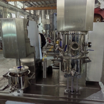 現(xiàn)階段常用的行星攪拌機(jī)通常有兩個(gè)低速檔大行星攪拌槳(通常為多斜漿葉式,大麻花式,框式),一個(gè)或2個(gè)快速大行星攪拌槳(分散化盤)和刮壁槳構(gòu)成。